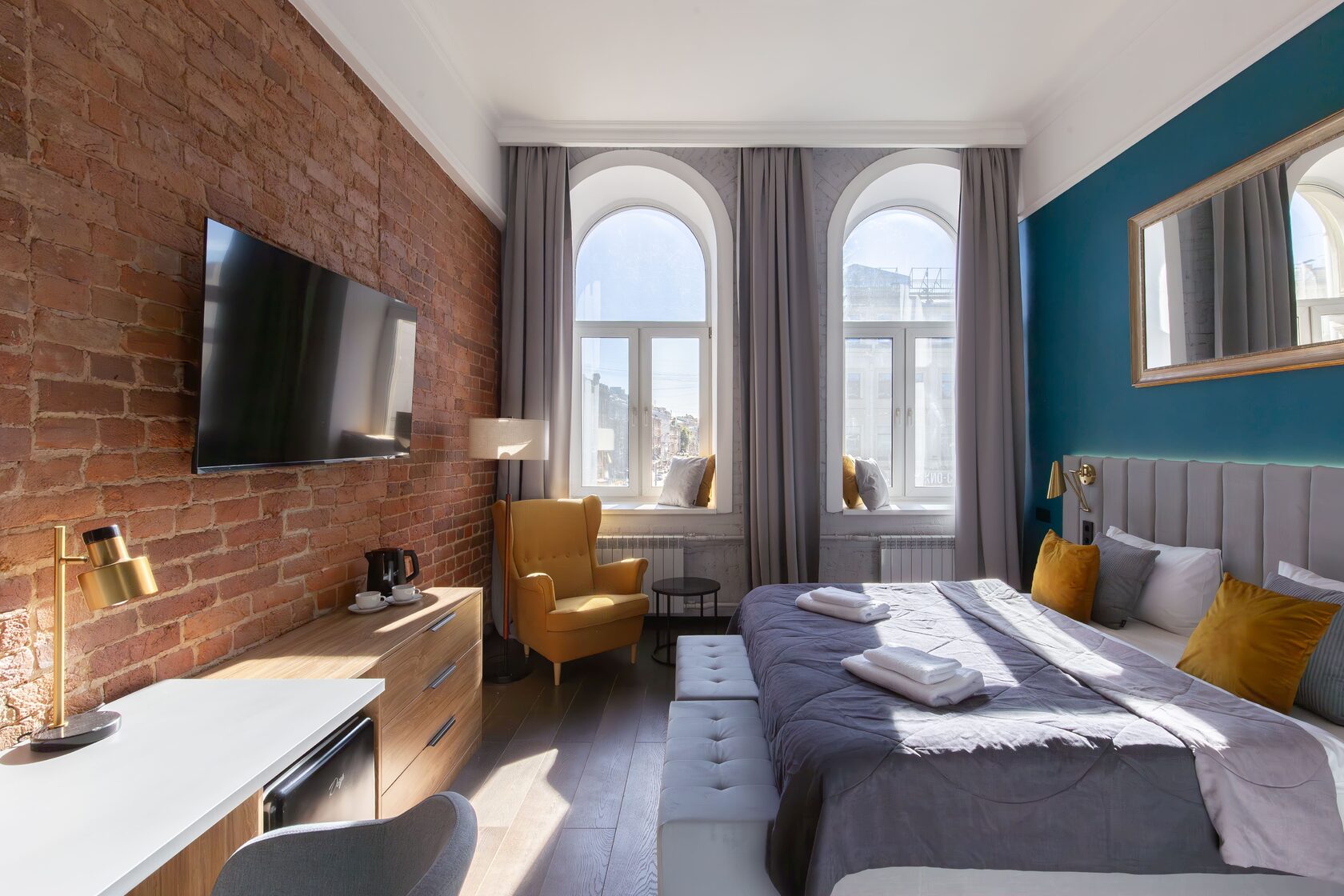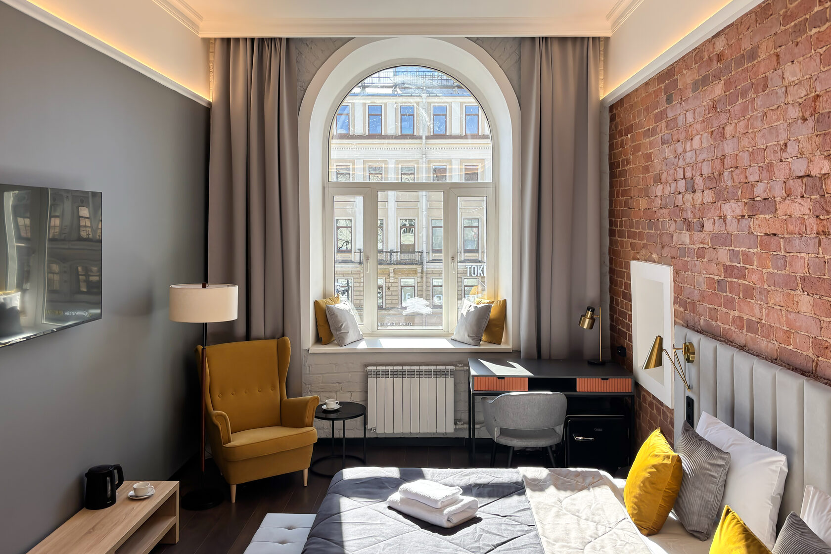 Просторный номер для 1-2 гостей. Оснащен собственным санузлом с душем и феном, предоставляется гигиенический набор. Из окна открывается шикарный вид на Невский проспект и вестибюль станции метро Маяковская. Гости могут выбрать размещение на большой кровати king size (180*200) или на двух одноместных кроватях (90*200). Также в номере есть телевизор Яндекс ТВ с Алисой, рабочий стол, большой встроенный шкаф, зеркало во весь рост и мини-холодильник.
