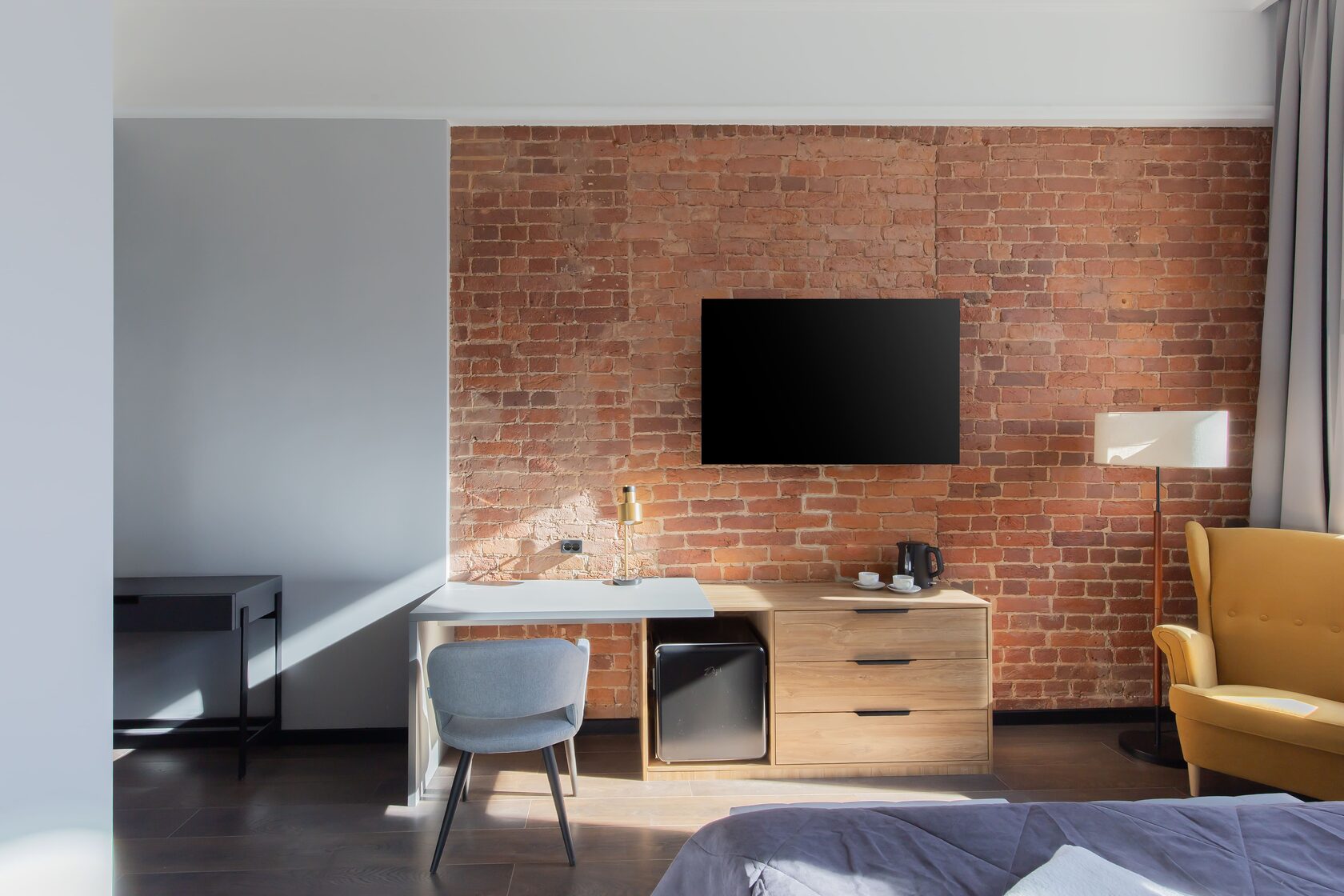 - Функциональное пространство. Просторное помещение площадью 28 м² обеспечивает достаточно места для отдыха. Для работы есть удобный рабочий стол. Также в вашем распоряжении кресло, большой встроенный шкаф, зеркало во весь рост и мини-холодильник